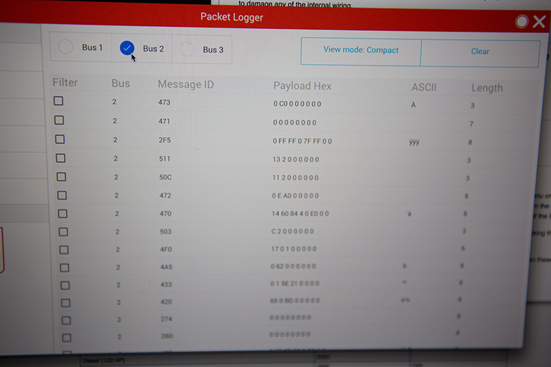 Now navigate to the Packet Logger screen from the menu on the left. Turn on logging for Bus 2 by clicking the Bus 2 toggle at the top of the screen. If your vehicle is powered on you should see data in the table!