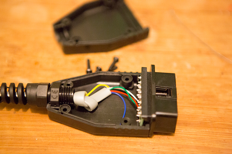 Unscrew the 4 phillips head screws holding the connector closed. Then carefully separate the housing and be sure not to damage any of the internal wiring.
